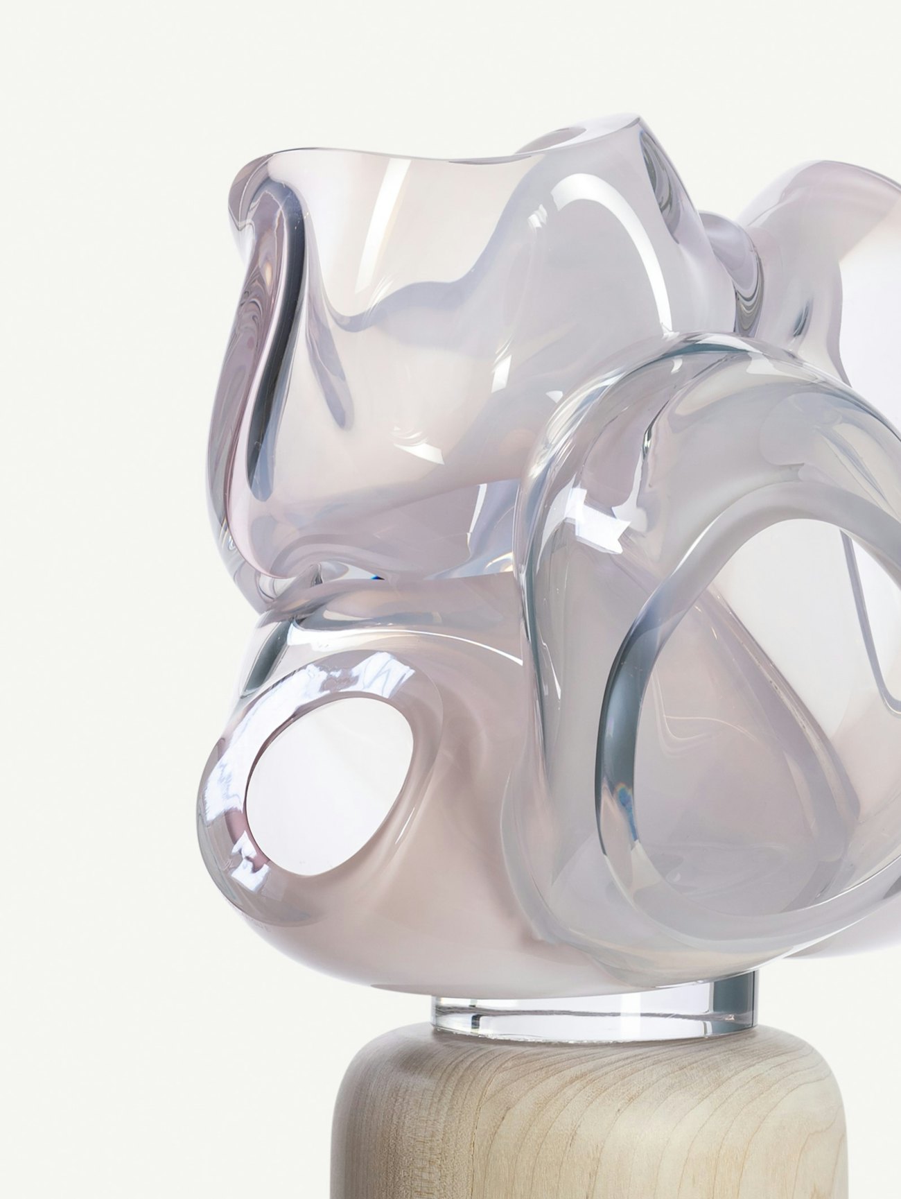 Lena Bergström’s exclusive series Heart Flowers is mouth-blown at Kosta Glassworks. The pink heart flower is unique and rests on a white-pigmented birch base. Each unique piece is signed by the artist.